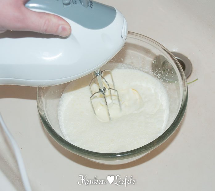 Maak de mixers schoon en klop de eiwitten in een andere vetvrije kom. Als de eiwitten wat steviger beginnen te worden, voeg je beetje bij beetje de overige 75 gram suiker toe. Klop verder tot glanzende, stijve pieken.