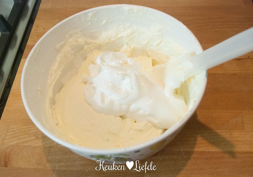 Daarna stijfgeslagen eiwit en stijfgeslagen slagroom beurtelings door het roomkaasmengsel spatelen.