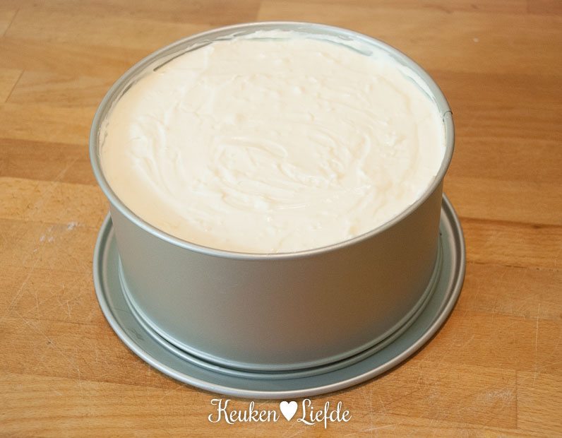 Spatel om en om de slagroom en eiwitten door het roomkaasmengsel, net zolang totdat alles op is en je een luchtige, gladde crème hebt. Giet de crème in de springvorm en strijk de bovenkant glad. Zet de cheesecake minimaal 4 tot 5 uur in de koelkast om op te stijven.
