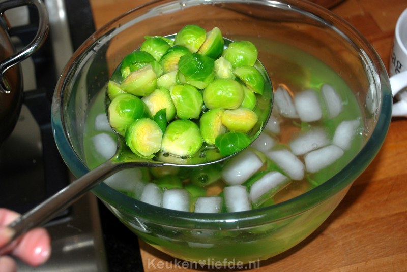 Schep ze met een schuimspaan uit de pan en leg ze direct in het ijswater. Schep de spruiten na ongeveer 15-20 seconden uit het water en laat ze uitlekken.