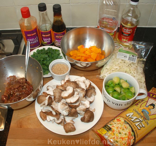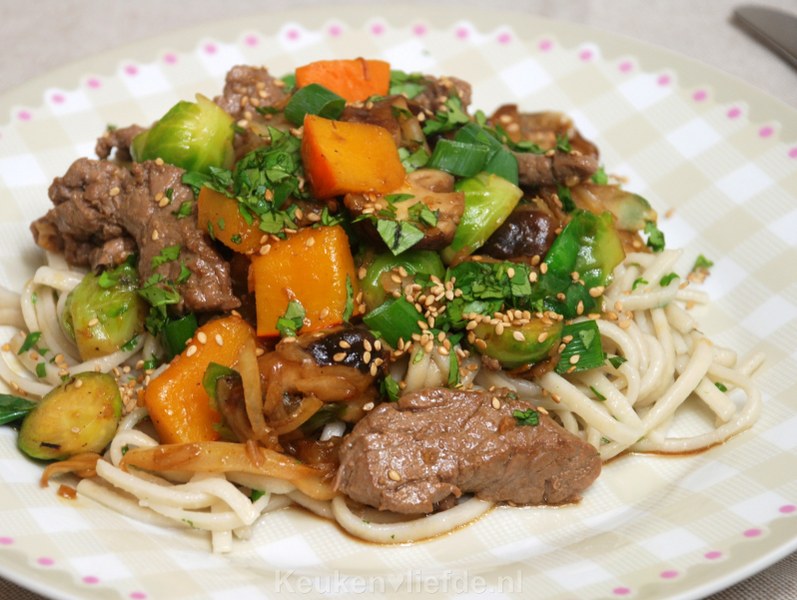 Een heerlijk Oosters roerbakgerecht met gemarineerde biefstuk en winterse groenten als pompoen en spruitjes. Ik blancheer de pompoen en spruitjes van tevoren zodat ze later dezelfde bereidingstijd hebben en ze hun mooie kleur behouden. Het vlees wordt gemarineerd en kun je eventueel, net als het blancheren, een dag van tevoren al doen. Zo zet je dit lekkere gerecht binnen 15 minuten op tafel!
