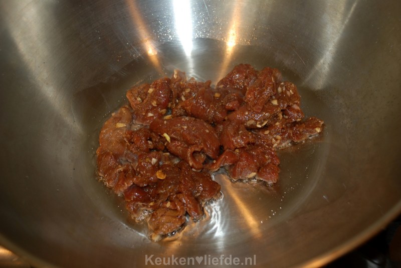 Snijd het vlees in lange, smalle repen en meng ze met een aantal eetlepels sojasaus, 1 tl gemberpoeder en de knoflook. Dek af en laat minimaal 30 minuten marineren.