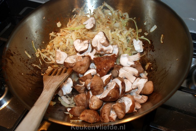 Verhit opnieuw wat olie in de pan en bak de witte kool op hoog vuur, ongeveer een minuut, totdat deze iets zachter is. Voeg de shiitake toe en bak een minuut verder.