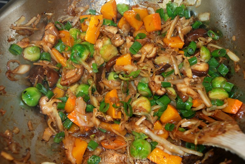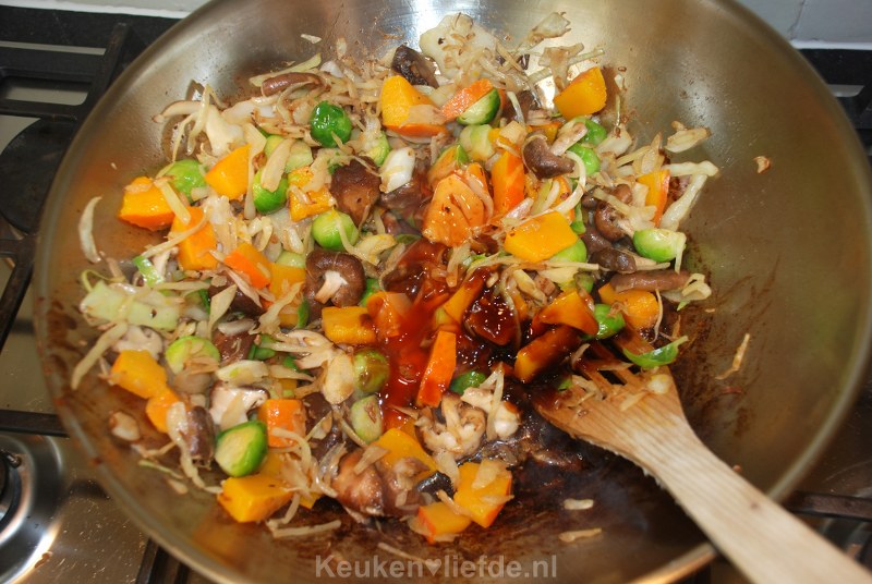 Voeg de pompoen en spruitjes toe en bak nog 30 seconden verder. Zet het vuur lager en voeg 2 el sojasaus, 2 el chilisaus en 1 el oestersaus toe en warm alles even door.