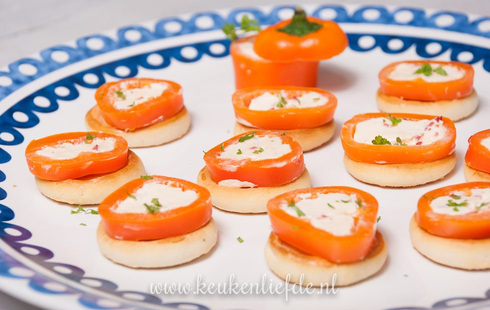 Is het al borreltijd? Want dan mag deze met roomkaas gevulde oranje snoeppaprika beslist niet ontbreken! Wat zien ze er feestelijk uit hè.