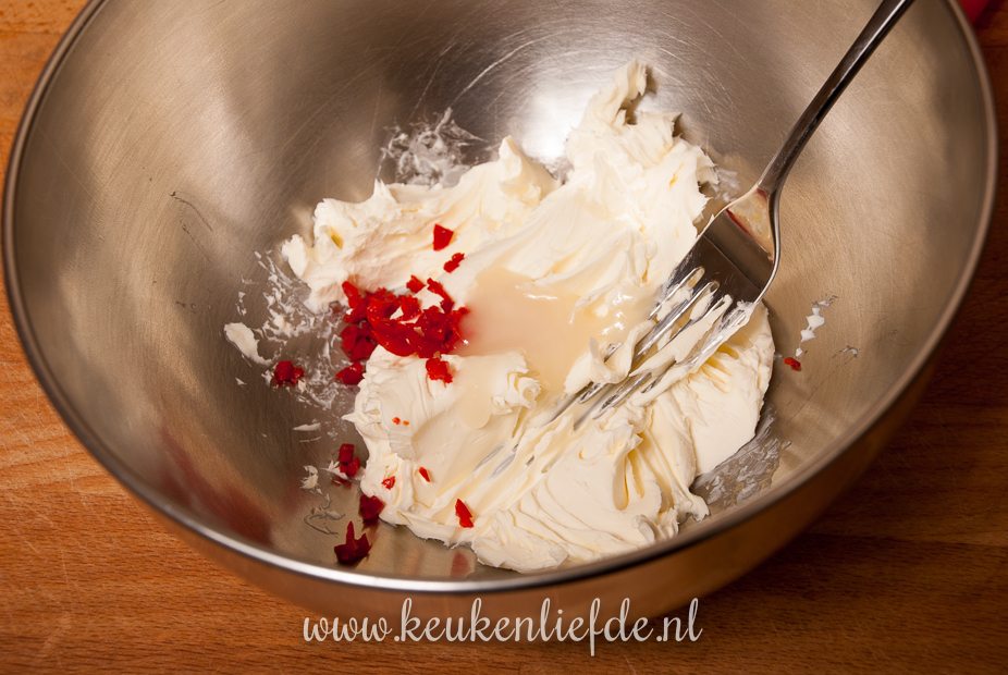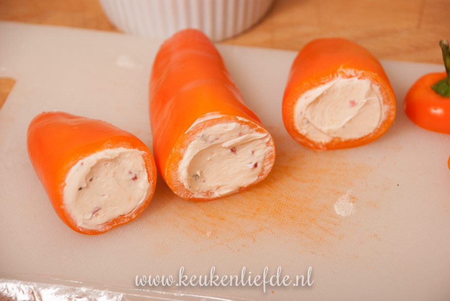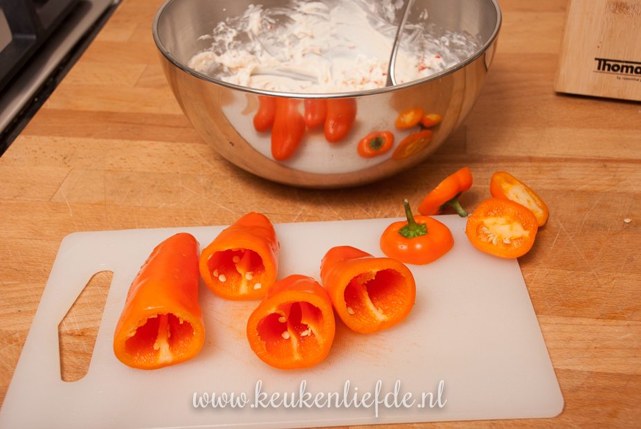 Snijd de bovenkant van de paprika’s (wel bewaren) en trek met je hand de zaadlijsten eruit. Vul de paprika’s met het roomkaasmengsel met behulp van een lepeltje. Druk de roomkaas goed aan, zodat de paprika’s goed gevuld zijn.