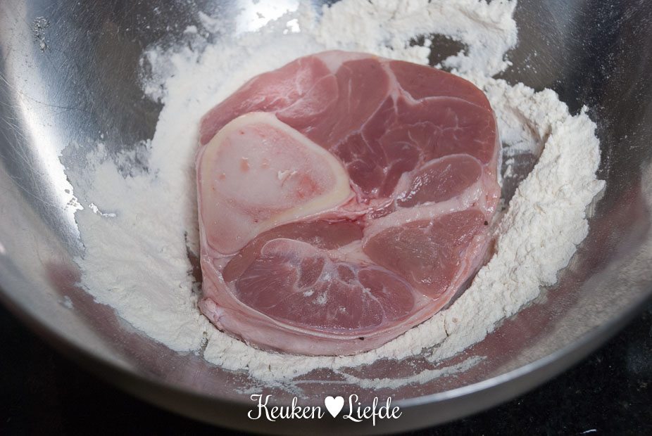 Verhit de braadpan en laat heet worden. Dep het vlees met keukenpapier droog en bestrooi met peper en zout. Doe de bloem in een ruime kom en wentel het vlees door de bloem. Klop het overtollige bloem eraf. Doe een scheutje olie in de braadpan en leg het vlees in de pan, niet al het vlees tegelijk. Braad het vlees aan de beide kanten even kort bruin en haal het uit de pan. Leg de kalfsschenkels op een bord en zet opzij.