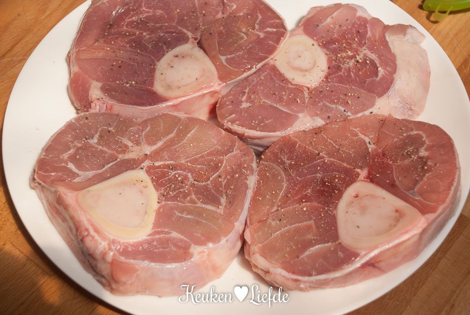 - 4 kalfsschenkels (1,7 tot 2 kilo), in stukken van ca. 3 tot 4 cm dik