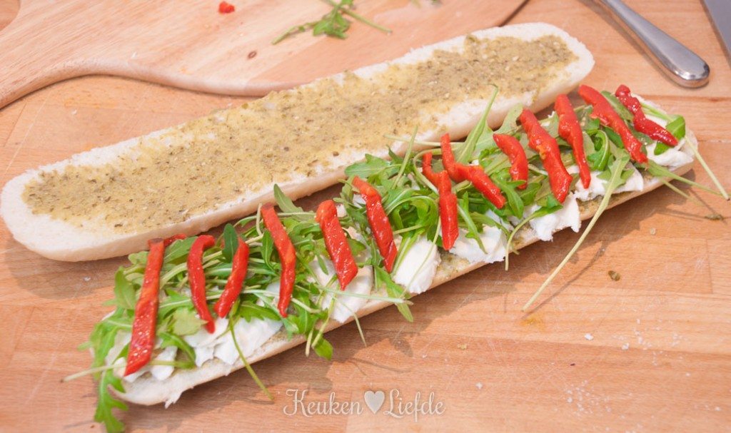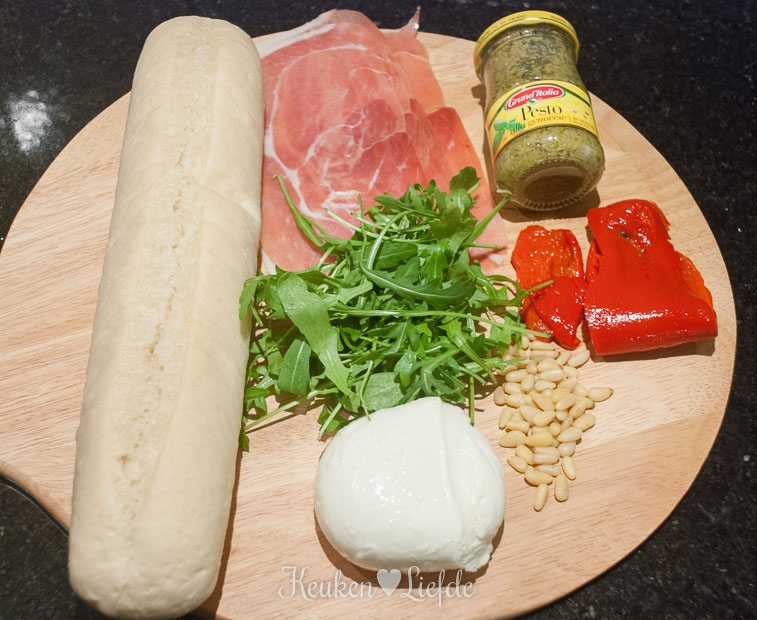 Verwarm de contactgrill. Snijd het ongebakken stokbroodje over de lengte doormidden en besmeer beide helften met 1 eetlepel pesto. Beleg een helft van het stokbrood met plakjes mozzarella, rucola, paprika, Parmaham en bestrooi met de pijnboompitten. Bedek met de andere helft van het stokbrood.