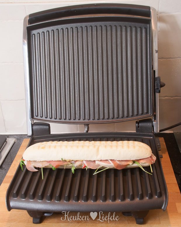 Ik ben dol op panini! Deze gegrilde sandwich is vaak gevuld met luxe ingrediënten en dat maakt hem tot een ideaal weekendgerecht! Ik serveer hem graag als lunch en zo nu en dan zelfs als licht hoofdgerecht, als er overdag al genoeg andere lekkernijen gesnoept zijn. Een afbakstokbroodje heb ik altijd in huis en voor de rest maak ik de panini met wat er op dat moment in de koelkast ligt. In het weekend zijn dat vaak wat luxere vis- of vleeswaren, die deze gegrilde sandwich extra feestelijk maken. Vandaag dus een panini met mozzarella en Parmaham, Yumm!