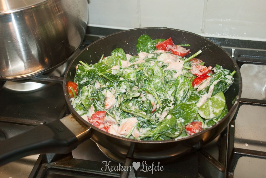 Voeg dan de spinazie toe (gebruik bij voorkeur een grotere pan dan ik, dat is wat makkelijker roeren…) en laat slinken. Breng goed op smaak met peper en zout. Zet het vuur uit en verdeel de cherrytomaten en zalmblokjes over de saus. Doe de deksel op de pan en laat kort even mee warmen.