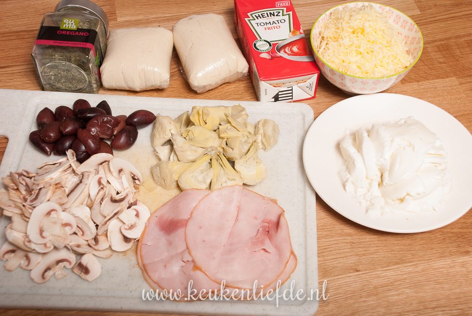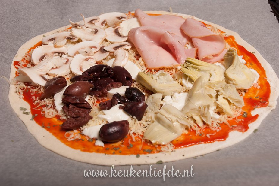 Bestuif het werkblad met bloem en rol het pizzadeeg uit tot een ronde lap. Leg de pizzabodem op het bakblik. Bestrijk het pizzadeeg met tomatenfrito — houd circa 1 cm van de rand vrij — en bestrooi met een beetje oregano. Beleg met plakjes mozzarella en Parmezaan. Beleg 1/4 van de pizza met ham, 1/4 met olijven, 1/4 met artisjok en 1/4 met champignons.