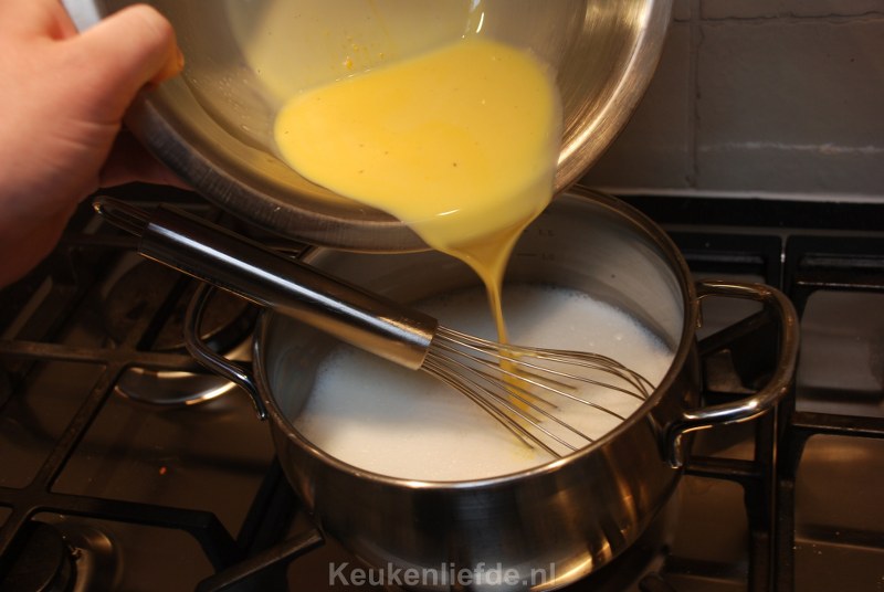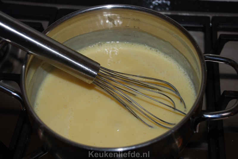 Maak de custardpudding volgens de bereiding op de achterkant van het pak maar met bovengenoemde hoeveelheden.