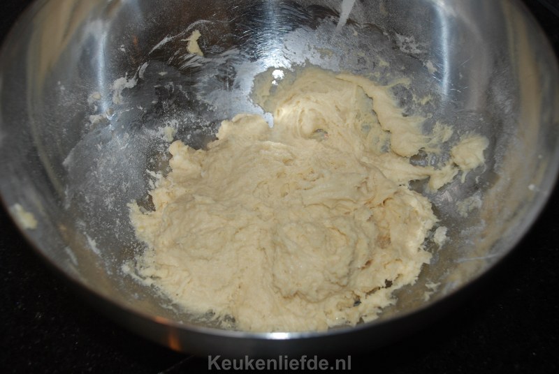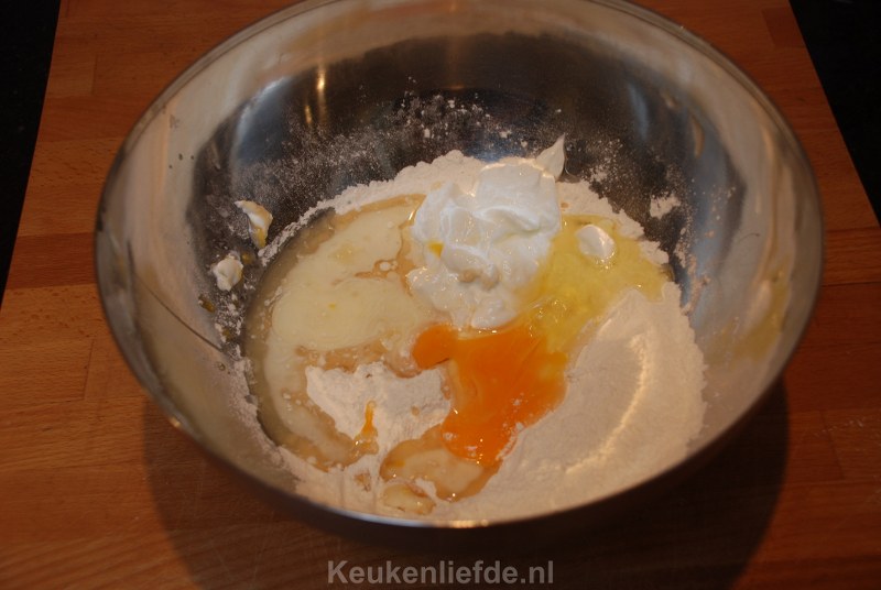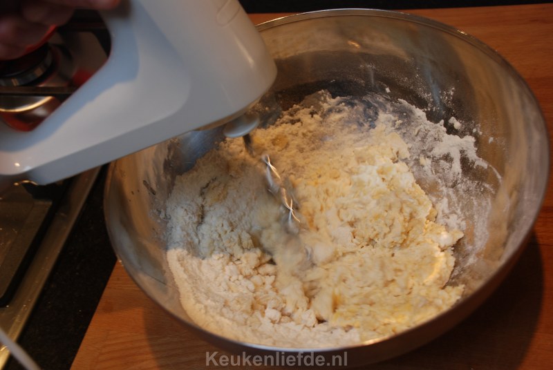 Haal de custardpudding van het vuur en zet zolang afgedekt apart. Verwarm de oven voor op 180 graden. Bekleed een bakplaat met bakpapier. Meng 300 gram bloem, het bakpoeder, de suiker, de vanillesuiker en een snufje zout in een kom. Voeg er de kwark, 5 el melk, de olie en 1 ei aan toe en kneed alles met de deeghaken van de mixer tot een glad deeg.