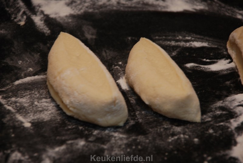 Leg de stukken op de bakplaat en druk ze voorzichtig met de hand wat platter. Maak in het midden een kuiltje.