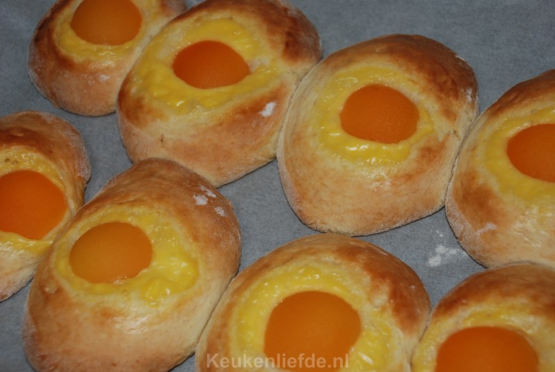 Roer de pudding nog een keer goed door met de garde en schep in elk kuiltje 1 grote eetlepel pudding. Plaats op elk puddinkje een halve abrikoos en bak ze 18-20 minuten in de oven totdat de broodjes goudbruin zijn.
