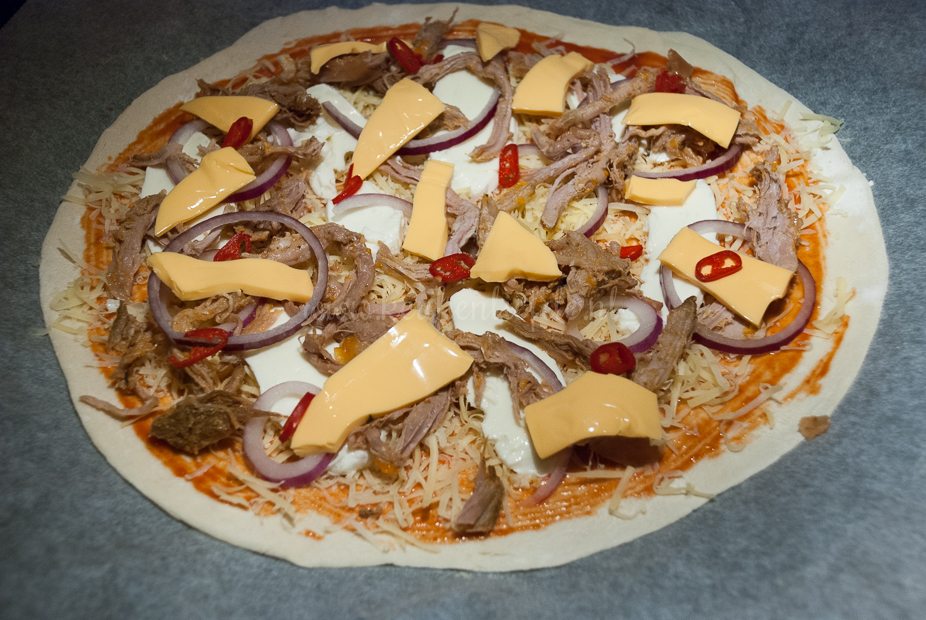 Rol het pizzadeeg uit tot een ronde of vierkante lap en bestrijk met barbecuesaus. Beleg de bodem met de geraspte Parmezaan, mozzarella, rode ui, pulled pork en voor de liefhebber het rode pepertje en cheddar.