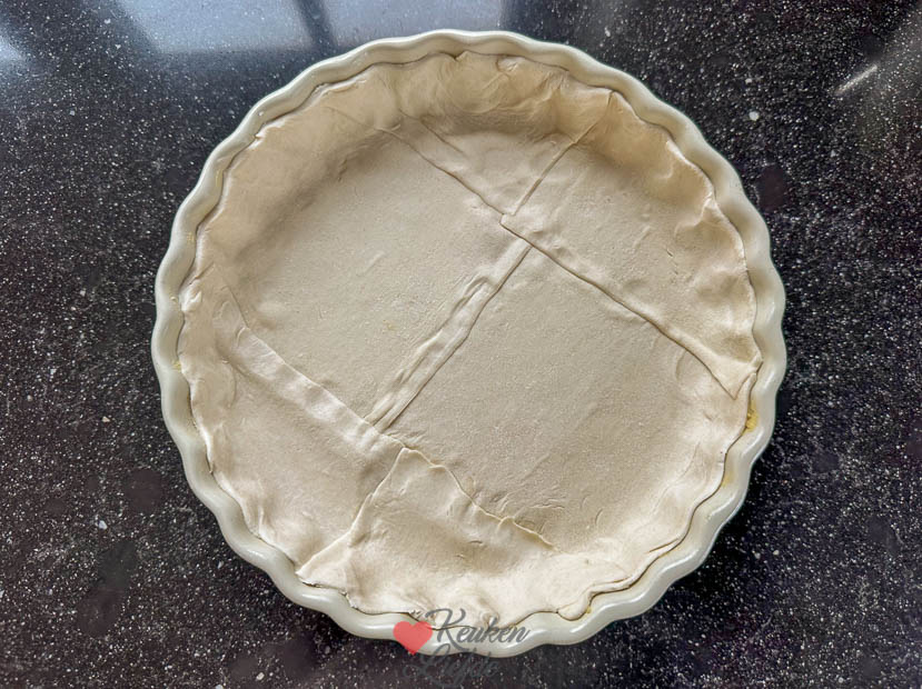 Je kunt de bodem maken van een rol kant-en-klaar quiche- of hartig taartdeeg, plakjes bladerdeeg uit de diepvries, of je kunt de bodem zelf maken van korstdeeg. Zelfgemaakt korstdeeg geeft een wat stevigere korst en bak je eerst blind voor. Kant-en-klaar quichedeeg of plakjes bladerdeeg hoef je niet blind voor te bakken.