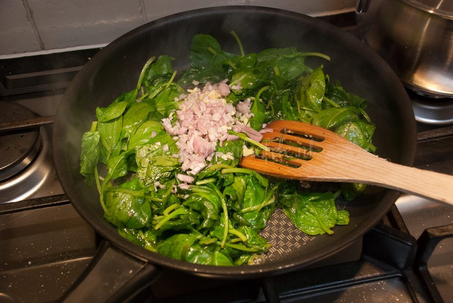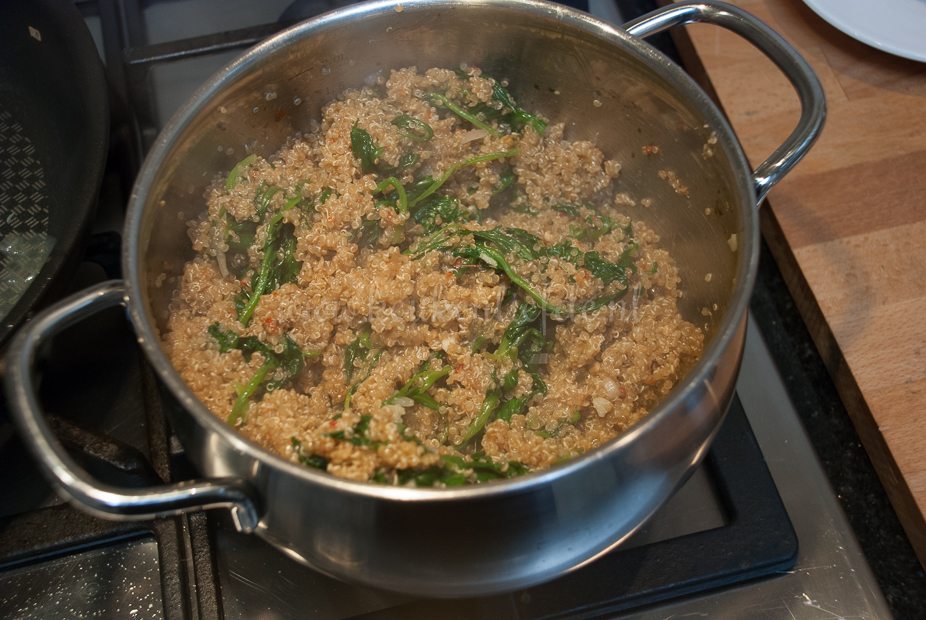 Kook ondertussen de quinoa gaar volgens de omschrijving op het pak. Verhit een koekenpan of wok met wat olie en bak op hoog vuur de spinazie, totdat deze geslonken is. Voeg halverwege de baktijd de sjalot en knoflook toe.