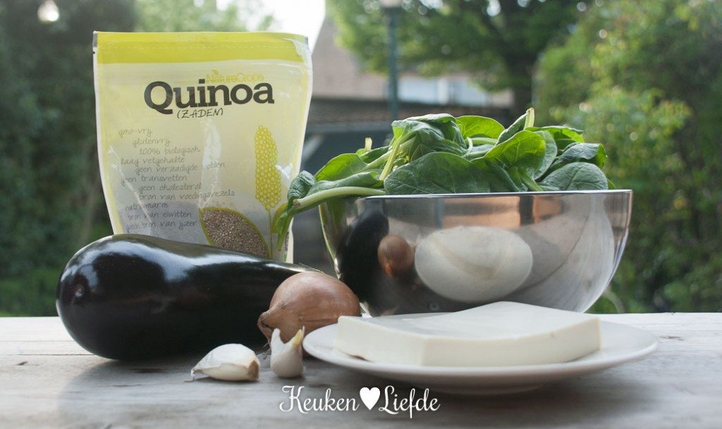 Giet de quinoa af en roer de spinazie erdoor. Als de spinazie geslonken is mag de aubergine en verkruimelde feta erbij.