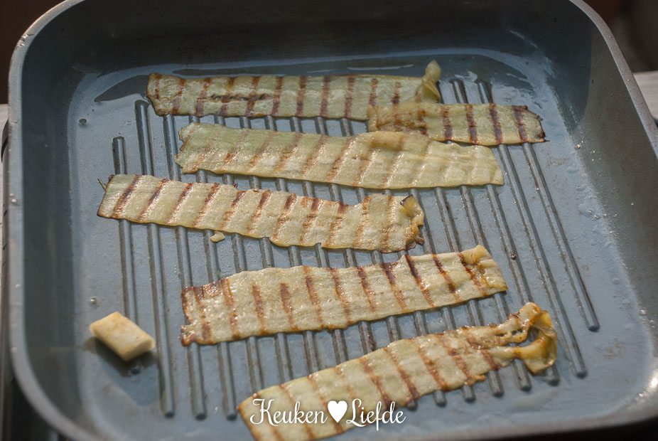 Draaf eens naar de winkel dan! Je bent moe? Nou vooruit, je mag de aubergineplakken ook grillen in de oven – op de grillstand – of eventueel bakken in een koekenpan. Maar, alleen omdat je moe bent en ik het allerbeste met je voor heb …