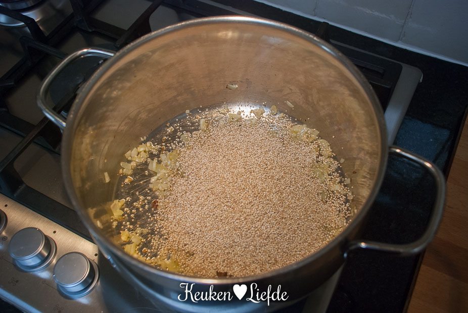 Verhit een wok of koekenpan met wat bakolie en fruit de ui en knoflook, totdat ze zacht maar niet bruin zijn. Voeg het verkruimelde bouillontablet en de quinoa toe en fruit kort even mee. Schenk ruim kokend water over de quinoa, zet het vuur laag en kook de quinoa zachtjes gaar zoals staat omschreven op de achterkant van het pak.