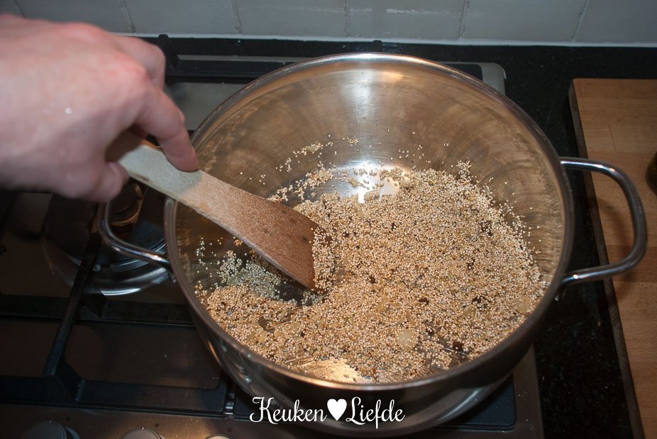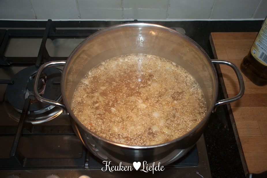 Verhit een wok of koekenpan met wat bakolie en fruit de ui en knoflook, totdat ze zacht maar niet bruin zijn. Voeg het verkruimelde bouillontablet en de quinoa toe en fruit kort even mee. Schenk ruim kokend water over de quinoa, zet het vuur laag en kook de quinoa zachtjes gaar zoals staat omschreven op de achterkant van het pak.