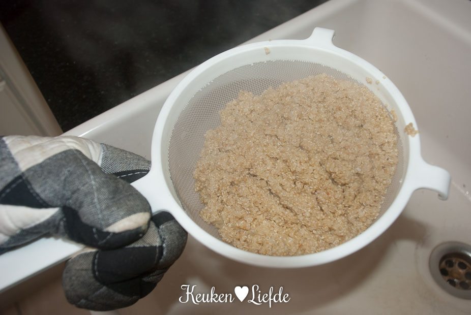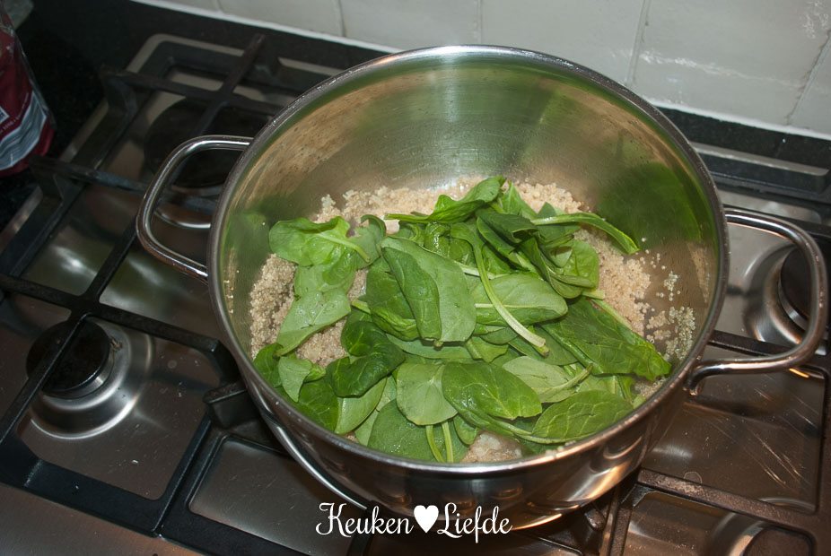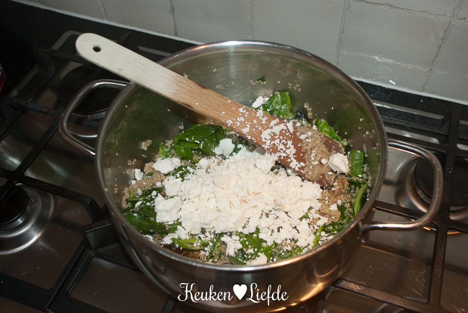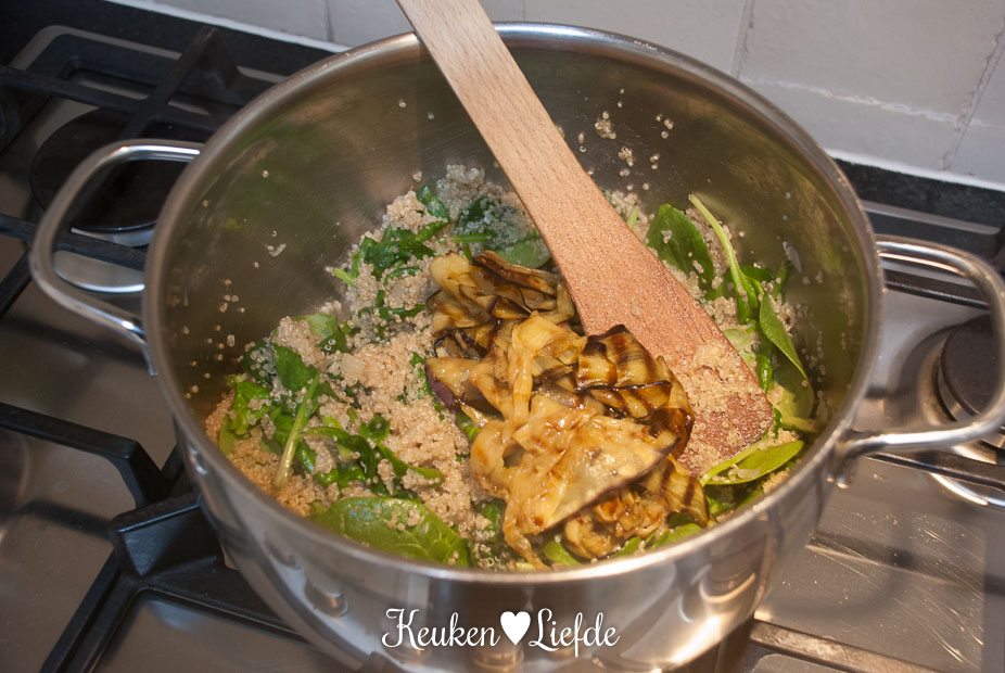 Giet de quinoa af en roer de spinazie erdoor. Als de spinazie geslonken is mag de aubergine en verkruimelde feta erbij.