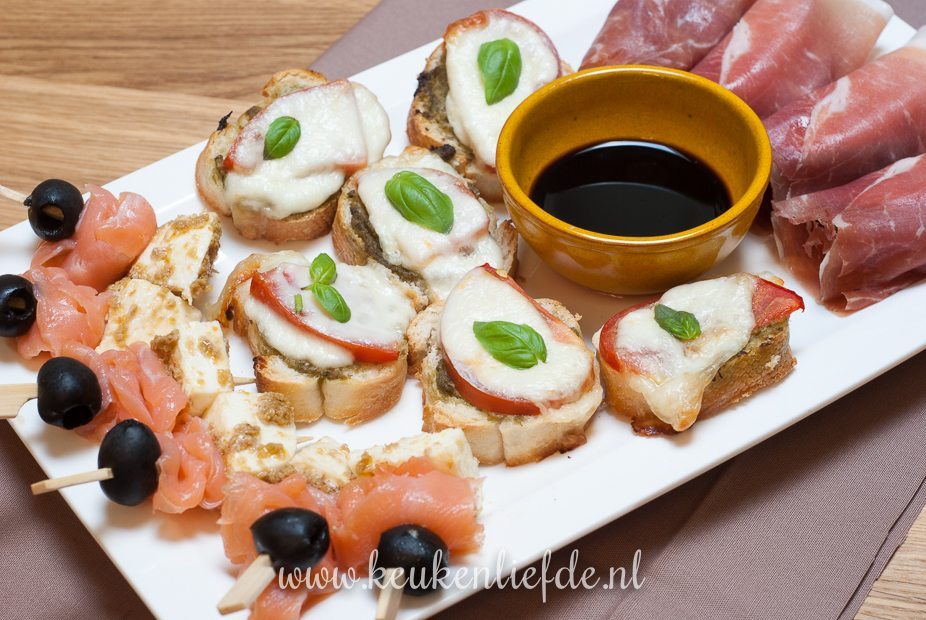 Mozzarella in blokjes snijden en marineren in pesto, of olijventapenade. Om en om met reepjes gerookte zalm en olijven aan spiesjes rijgen.
