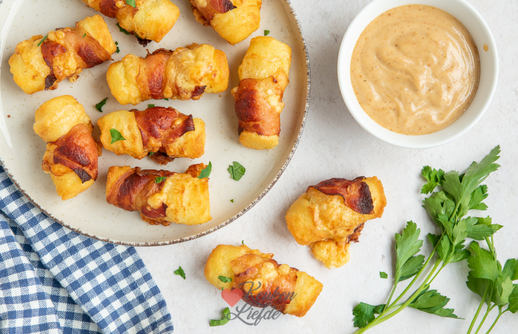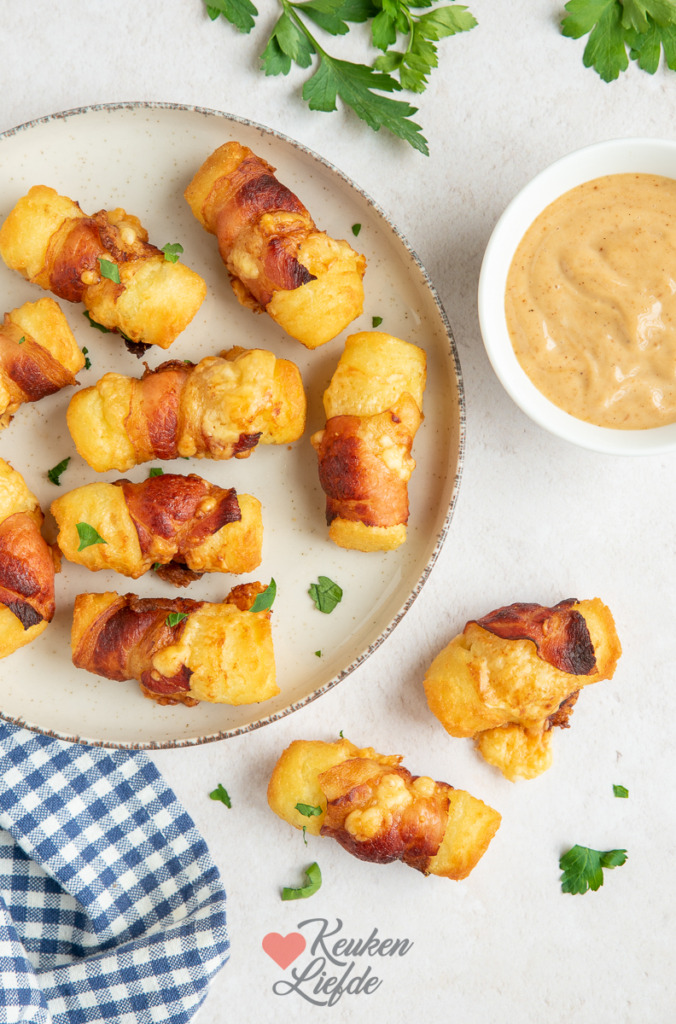 Wees gewaarschuwd, deze aardappelkroketjes omwikkeld met kaas en spek zijn verslavend lekker! Wij serveren ze graag bij een stukje vlees of kip en wat groenten, maar je kunt ook als hapje of snack serveren. Geef er dan een dipsaus bij gemaakt van twee delen barbecuesaus en één deel mayonaise.