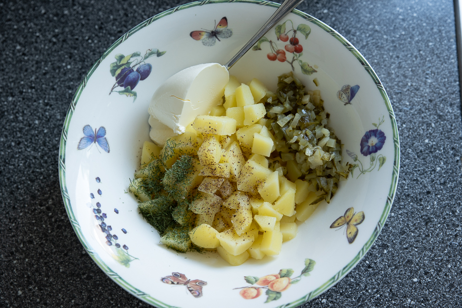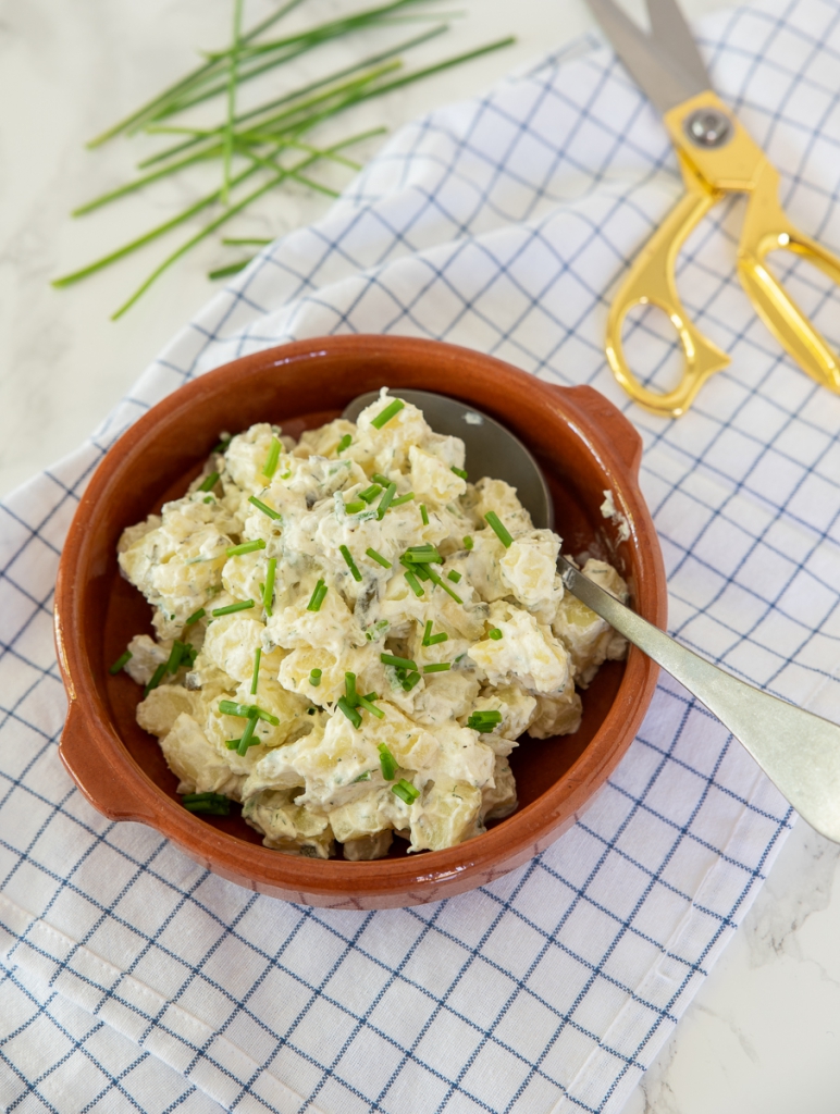 Deze aardappelsalade is heerlijk romig door de crème fraîche. Het kleingesneden augurkje zorgt voor een lekkere bite en een frisse smaak. Ook verse tuinkruiden mogen niet ontbreken! Ik gebruik dille en bieslook, die passen hier heerlijk bij. Enjoy!