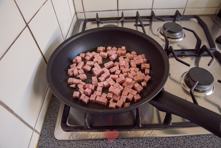 Verhit ondertussen een koekenpan met 1 eetlepel olijfolie en bak de hamblokjes op hoog vuur tot ze goudbruin zijn. Laat ze afkoelen.