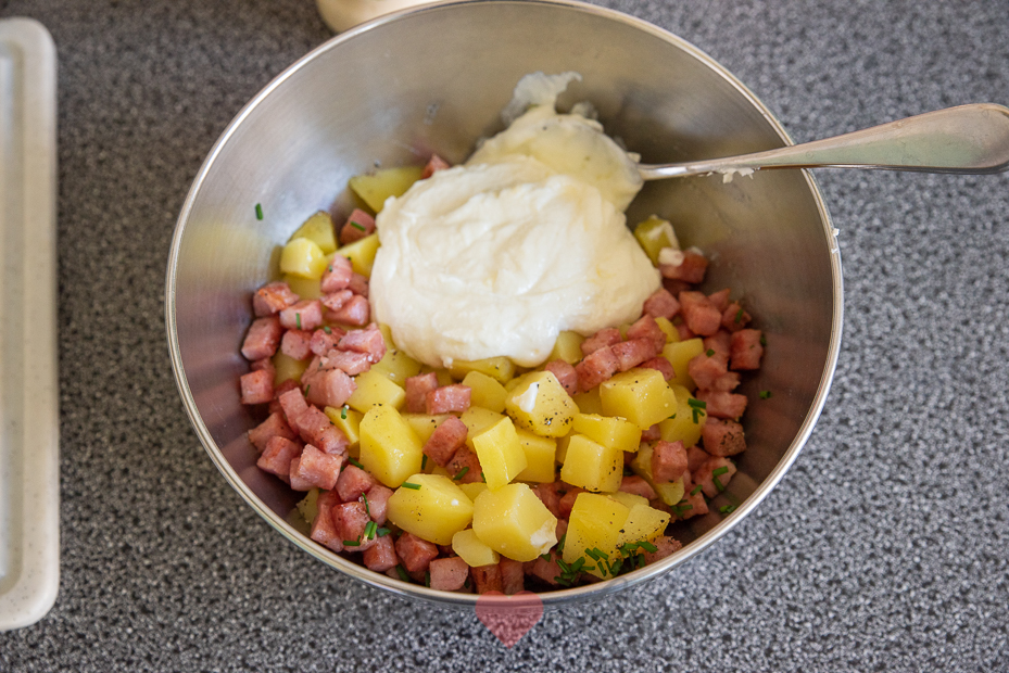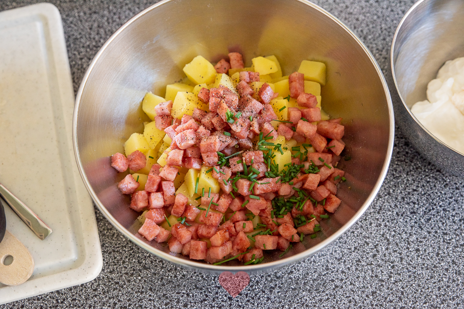 Meng de aardappelblokjes in een kom met de hamblokjes en de overige ingrediënten. Breng op smaak met zout en peper.