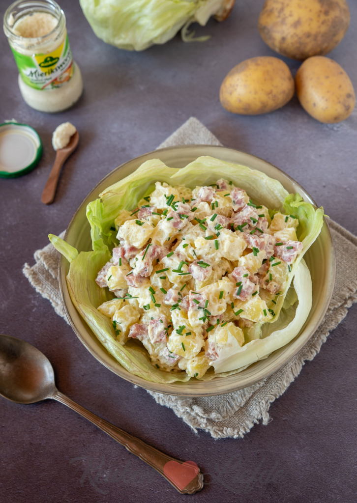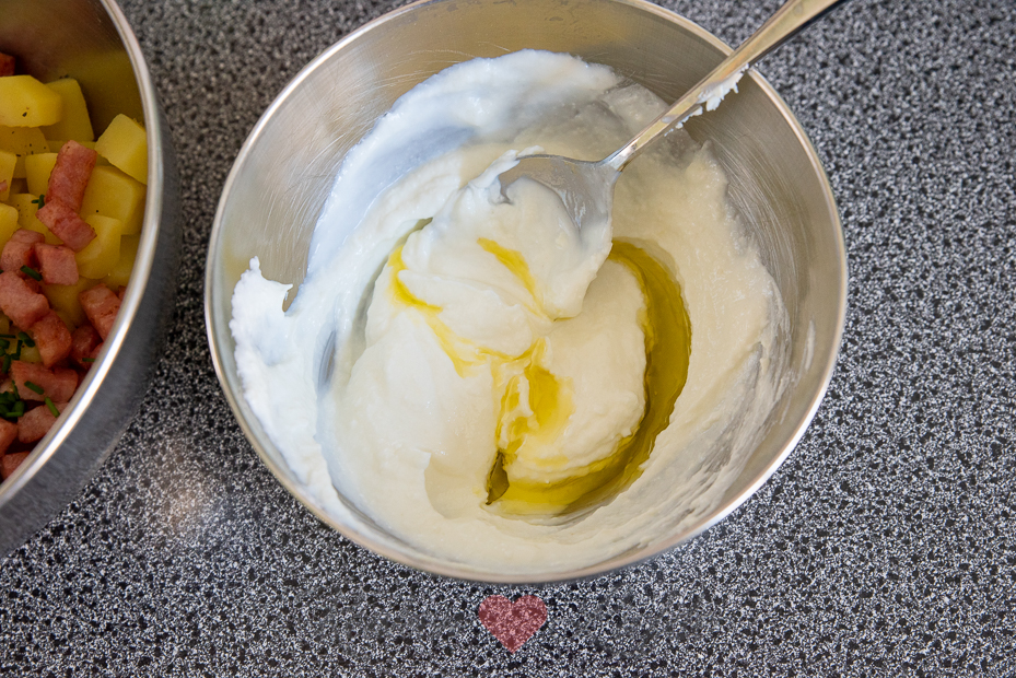 Aardappelsalade met ham en een romige saus van Griekse yoghurt. De mierikswortel geeft deze aardappelsalade een beetje pit. Heerlijk bij geroosterd vlees van de barbecue.