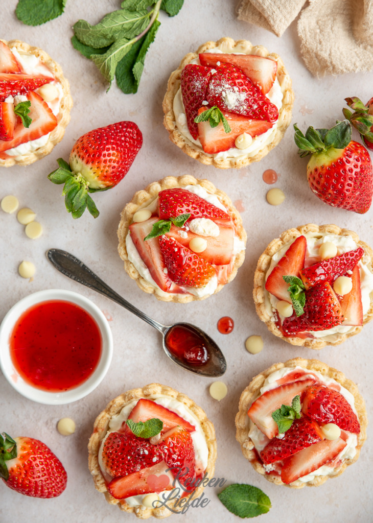 Deze aardbeiengebakjes zijn een echte traktatie en heel makkelijk om te maken. De bodem van bladerdeeg suikerschelpen is ingesmeerd met een dun laagje witte chocolade, gevuld met mascarponeroom en afgetopt met zoete aardbeien en aardbeiensaus.