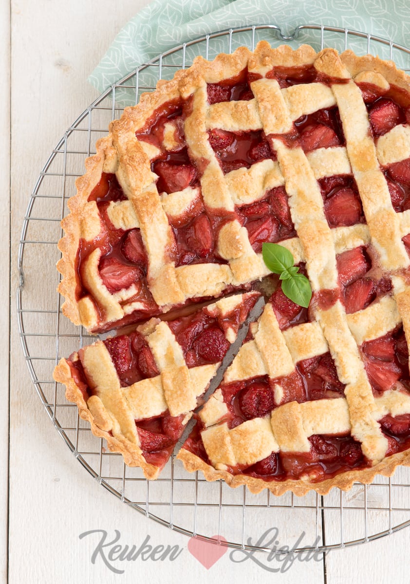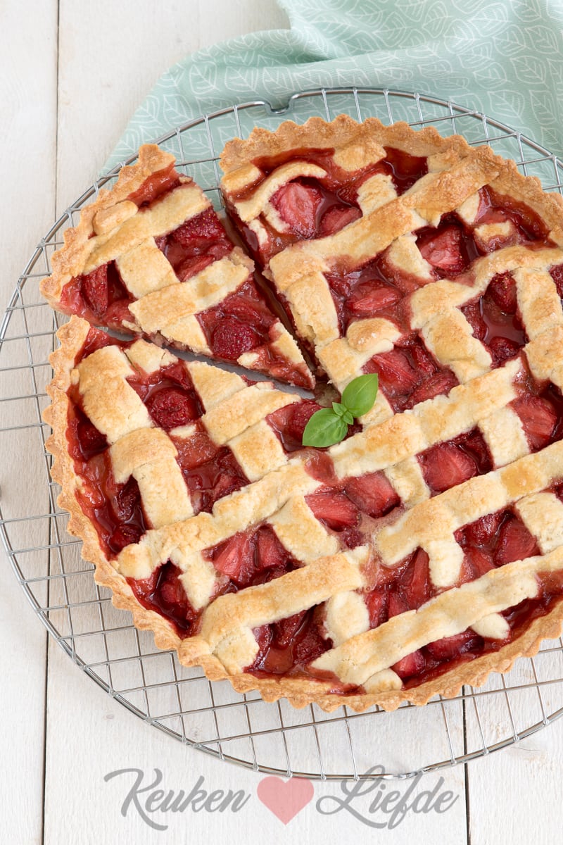 Bestuif een werkblad met wat bloem. Rol 2/3 van het deeg uit tot een ronde lap en bekleed de taartvorm hiermee. Verdeel de aardbeienvulling over de bodem. Rol het overige deeg uit en snijd in lange, smalle repen. Bedek de taart met de repen deeg. Bestrijk het deeg met losgeklopt ei. Bak de taart in het midden van oven circa 30 minuten, of totdat het deeg goudbruin is.