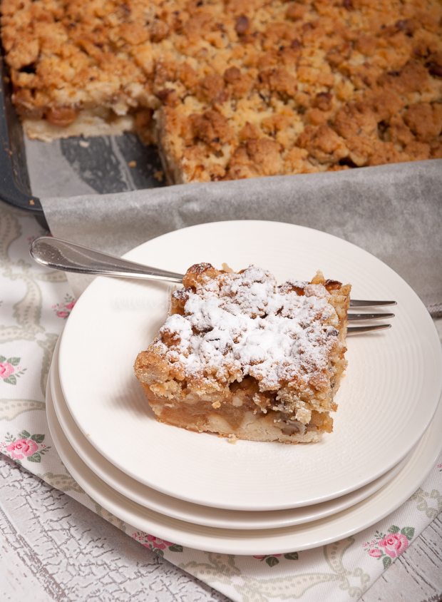 Heerlijk recept hoor! Maar ik heb in tegenstelling tot andere reacties wel de 1,5kilo appels gebruikt & vond de verhouding daardoor perfect. Mijn bakvorm had de afmeting 23x32cm. Ik haalde er 12 stukken uit. Bedankt voor het goede recept!