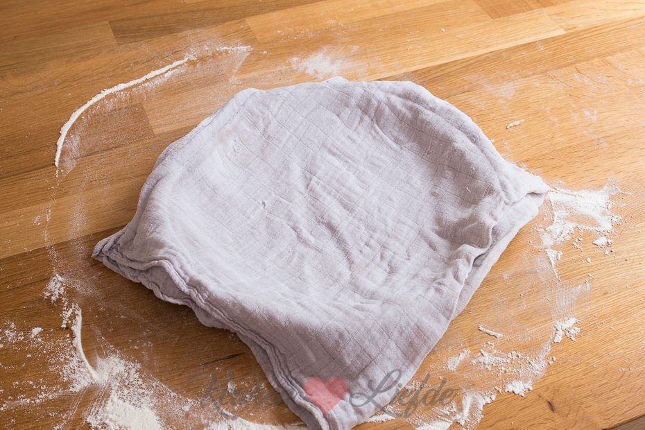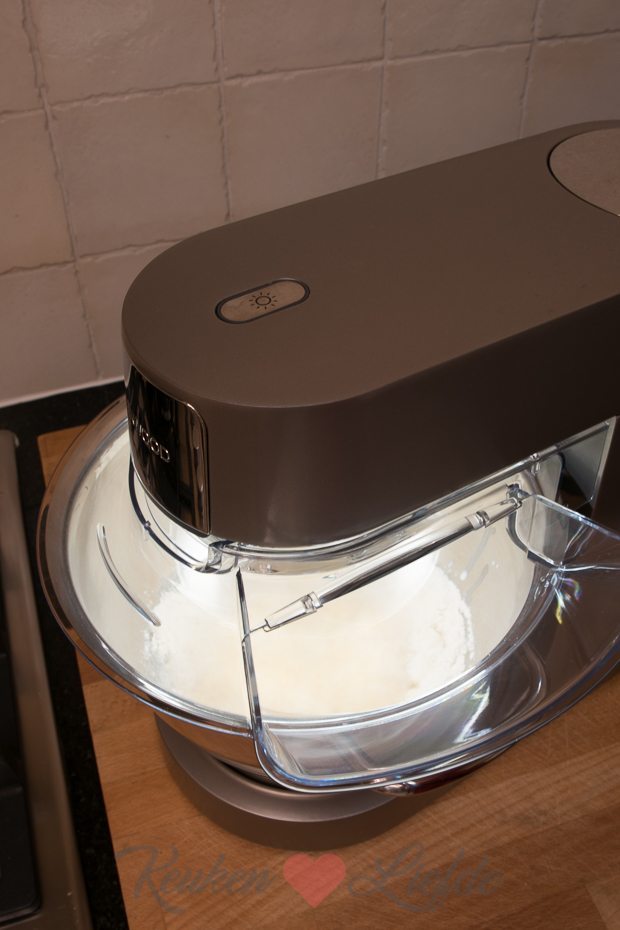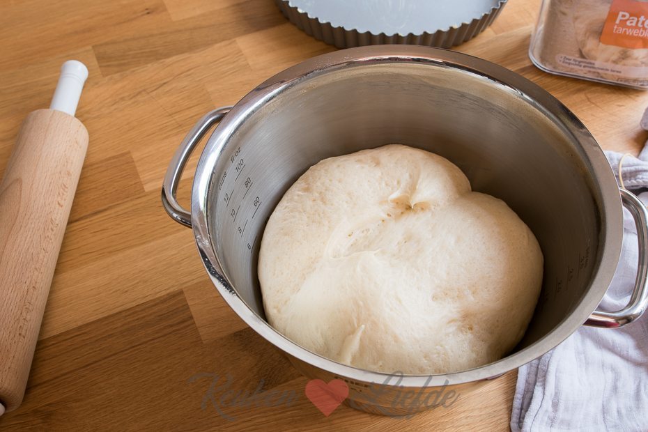 Dek het deeg in de kom af met een vochtige theedoek (ik trek altijd een elastiek om de rand, zodat de kom goed is afgesloten) en laat op een warme plek (ik gebruik de rijsstand in de oven) 30 minuten rijzen, totdat hij in volume verdubbeld is.