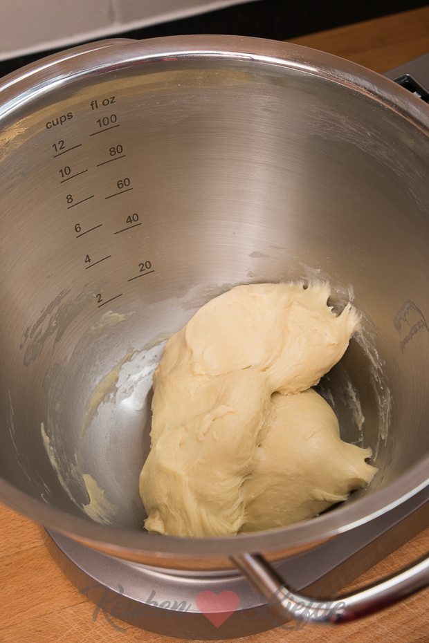 Verwarm de melk tot lauwwarm. Voeg de gist en een klein beetje van de suiker toe en roer goed door. Laat enkele minuten staan zodat de gist actief kan worden — er zal een schuimlaagje bovenop het mengsel ontstaan. Doe de bloem en het zout in de kom van de Chef Titanium en roer door. Voeg de boter, de eidooier, de overige suiker en het gistmengsel toe en kneed het deeg minimaal 10 minuten met de deeghaak. Begin met kneden op een lage stand en zet de machine daarna op een iets hogere stand. Uiteindelijk moet het deeg aanvoelen als een post-it — het moet soepel en elastisch zijn en mag net niet blijven plakken.