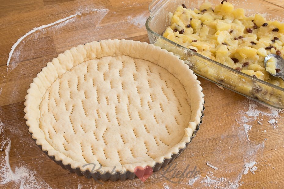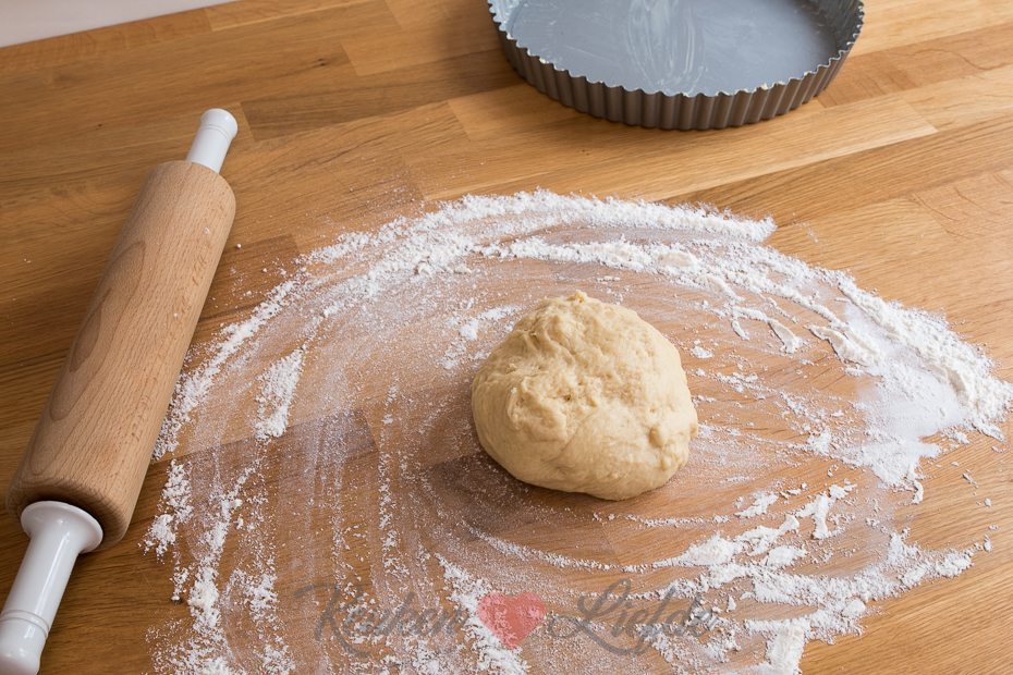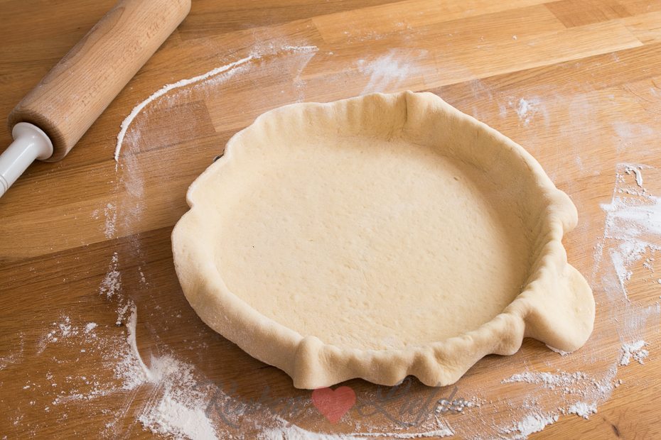 Duw met je vuist de lucht uit het deeg. Rol hem, op een met bloem bestoven aanrecht, uit tot een lap die iets groter is dan de vlaaivorm. Leg de deeglap voorzichtig in de springvorm en druk het deeg goed in de randen. Snijd het overtollige deeg aan de bovenkant eraf. Dek met een vochtige theedoek losjes af en zet opzij.