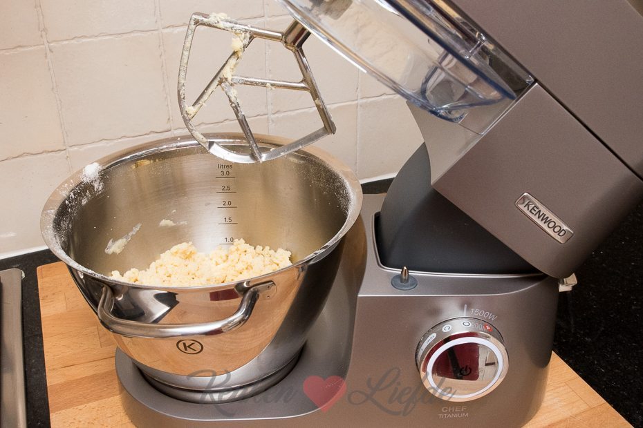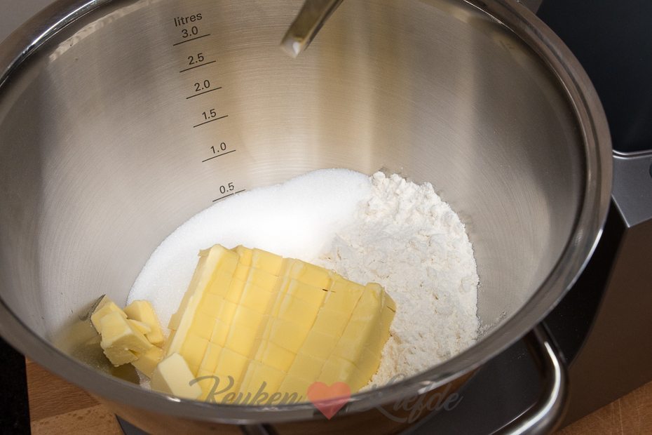 Bevestig de K-klopper op de Chef Titanium. Doe de bloem, suiker en boter in de kom en mix op middelhoge stand, totdat je kruimels hebt. Duw af en toe met een mes de vastgeplakte boter aan de K-klopper terug in de kom.