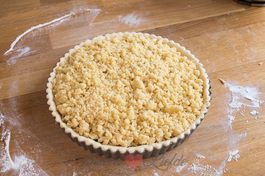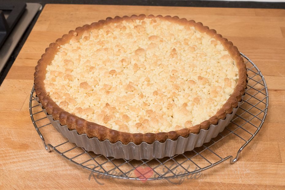 Zet de vlaai op een rooster in het midden van de oven. Bak hem in circa 25 minuten gaar, of totdat de rand goudbruin is en de kruimels beginnen te kleuren.
