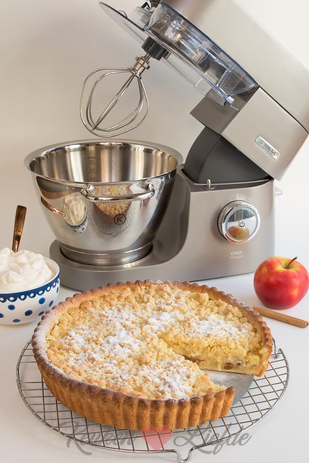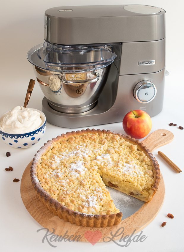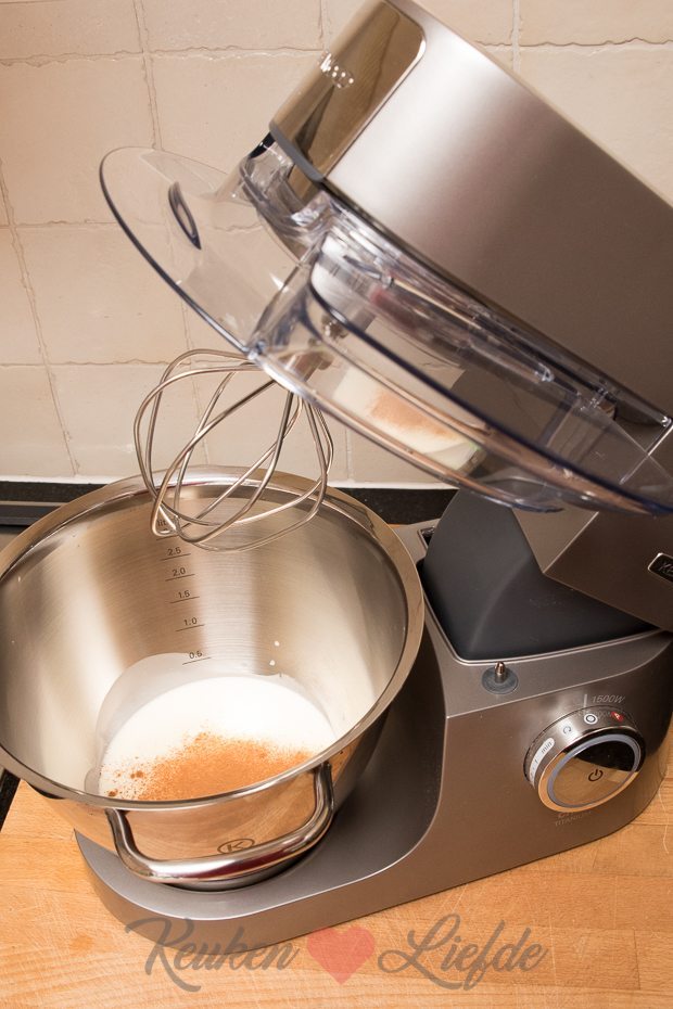Maak ondertussen als de vlaai in de oven staat de kaneelroom. Bevestig de ballongarde op de Chef Titanium en doe de slagroom, vanillesuiker en kaneelpoeder in de kom. Klop de slagroom op hoge stand lobbig. Schep in een schaal, dek af met vershoudfolie en zet zolang in de koelkast.