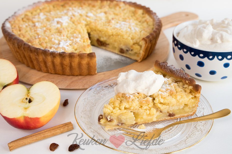 Laat de vlaai afkoelen op een rooster. Haal de vlaai voorzichtig uit de taartvorm en serveer op een mooie schaal. Bestrooi eventueel met poedersuiker en serveer met de kaneelroom.