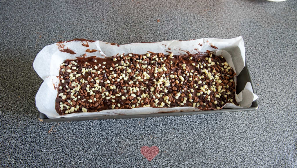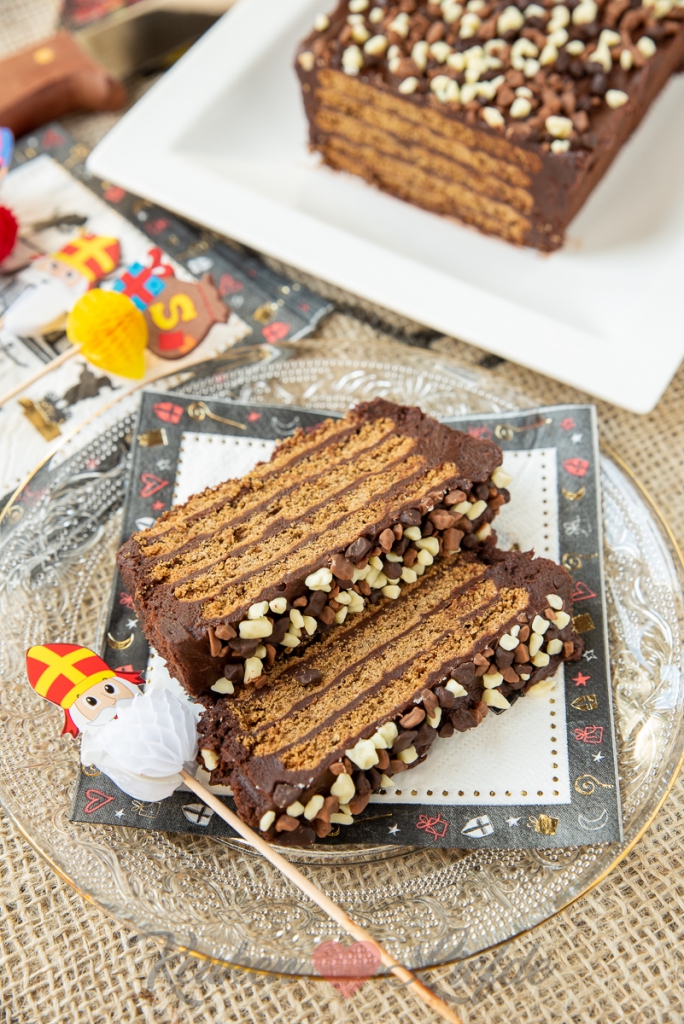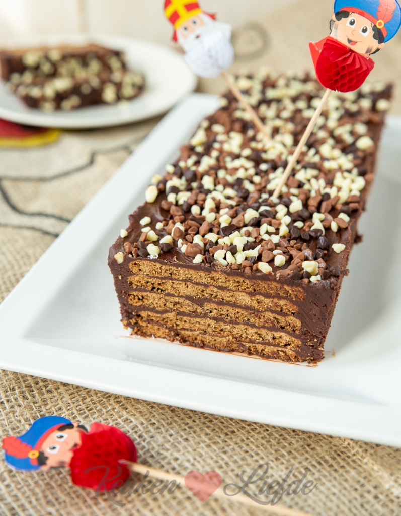 Van het weekend heb ik er 1 gemaakt met (chocolade) pepernoten, 250 gr Blue Band, 1 melk + 1 pure chocolade reep en 200 gr donkere basterdsuiker. Ook in dit recept hoorde oorspronkelijk een ei, maar die heb ik weggelaten en nergens door vervangen.