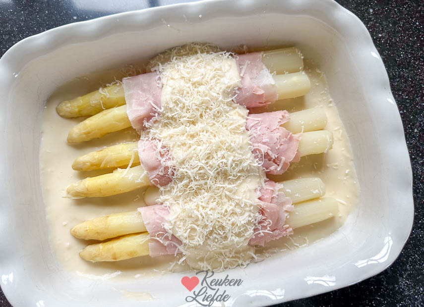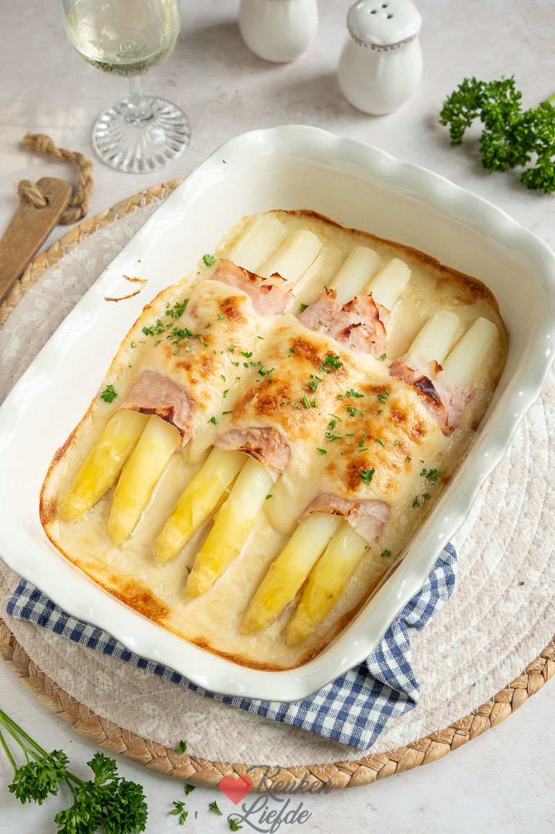 Een heerlijke asperge ovenschotel: witte asperges opgerold in een plakje ham met kaassaus gegratineerd in de oven. Simpel en heel smakelijk. Lekker om te serveren met een gekookt krieltje of aardappelpuree. Eventueel kun je er ook nog een hardgekookt eitje (gehakt of in plakjes) bij serveren.