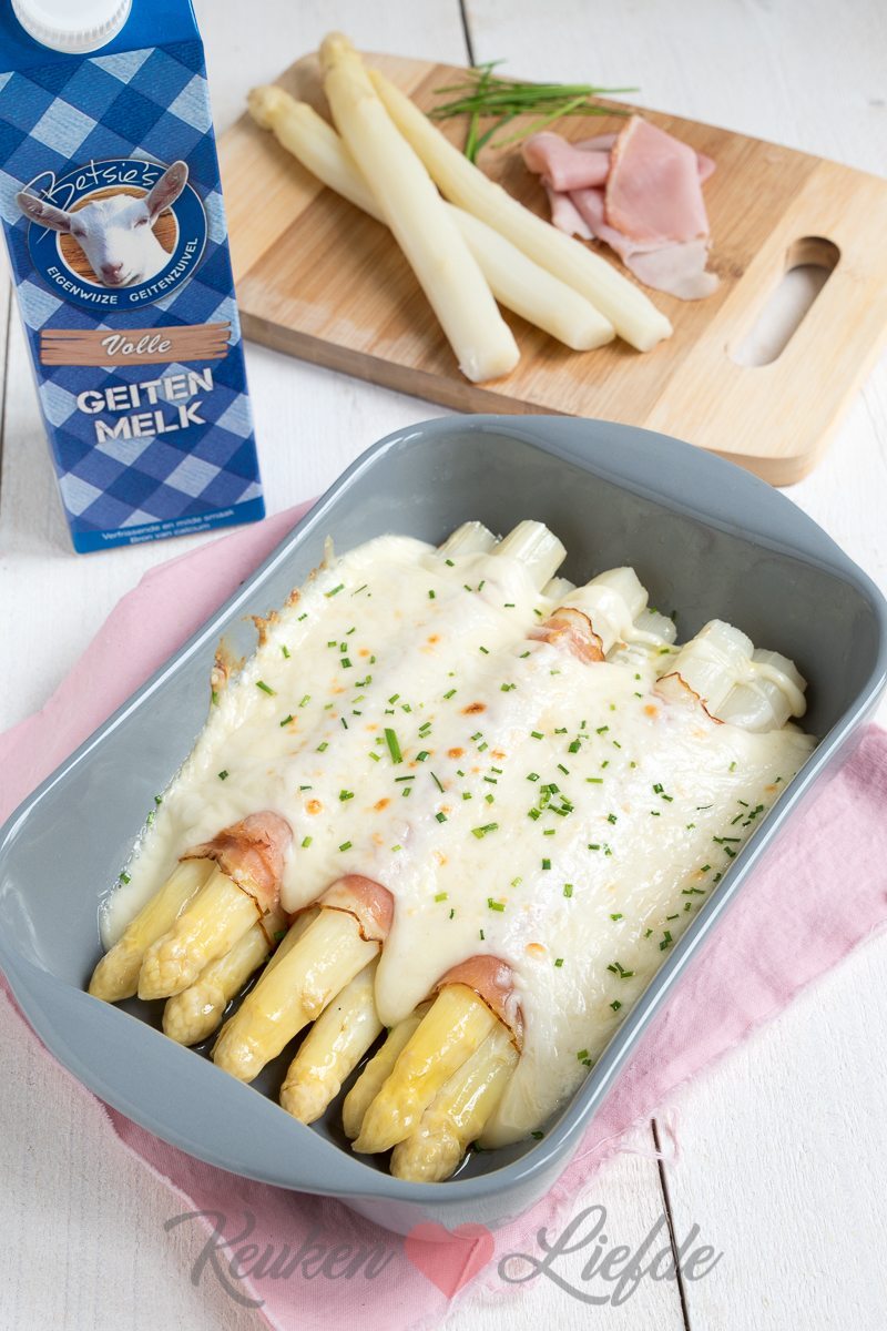 Wikkel 3 tot 4 asperges in een plak beenham en leg ze in de ovenschaal. Schenk de bechamelsaus eroverheen en bestrooi met de geraspte kaas. Bak circa 8 minuten in de oven, of totdat de bovenkant goudbruin is.