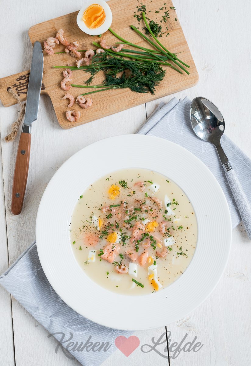 Deze romige aspergesoep is goed gevuld met verse aspergestukjes, hardgekookt ei, zalm en Hollandse garnalen. De verse dille en bieslook maken het smulfeest compleet!