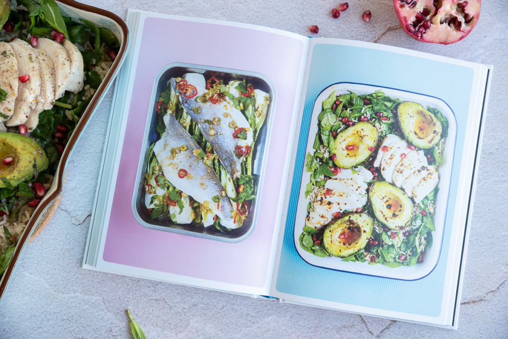 Deze kipsalade uit de oven met avocado, granaatappel en zilvervliesrijst komt uit het kookboek De makkelijke bakplaat van Rukmini Iyer. Het is tevens het coverrecept en bij de eerste blik op de foto wist ik, die wil ik maken. Ik ben een echte ovenkoker dus haar bakplaatboeken zijn op mijn lijf geschreven. Bovendien zijn haar recepten altijd makkelijk om te maken en hebben ze vaak een verrassende twist. Eerder deelde ik hier ook al een sinaasappelcake met hazelnoten uit haar kookboek De zoete bakplaat. De kipsalade met avocado, spinazie en zilvervliesrijst is heerlijk fris van smaak door de dressing met limoen, munt en granaatappelpitjes. De chilivlokken geven een aangename warmte. Je kunt deze kipsalade eten als hoofdgerecht, maar ik vond hem de volgende dag koud als lunch ook heerlijk. De avocado wordt in dit recept gegaard in de oven en ik kan daar nog steeds niet helemaal aan wennen. De textuur blijft nagenoeg hetzelfde maar de smaak veranderd iets. Ik vind avocado lekkerder als hij niet gebakken is, maar het is leuk om eens uit te proberen. Probeer het zelf en laat me weten wat je ervan vindt. Ik ben heel benieuwd!