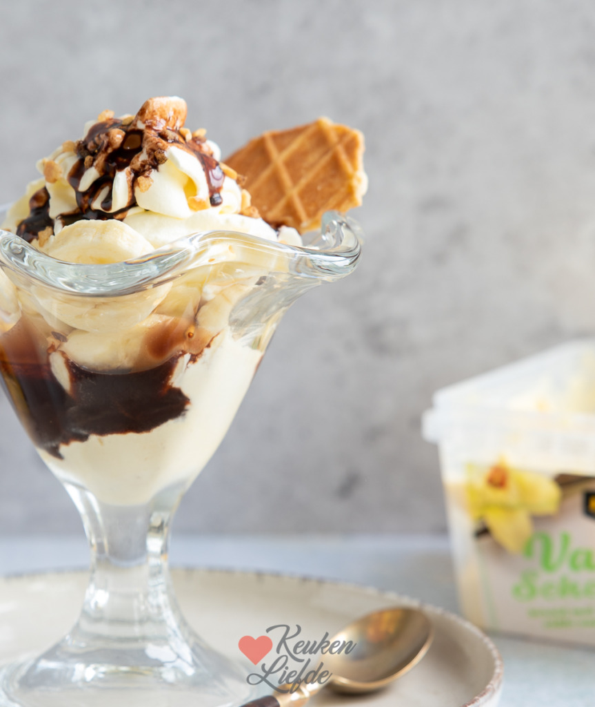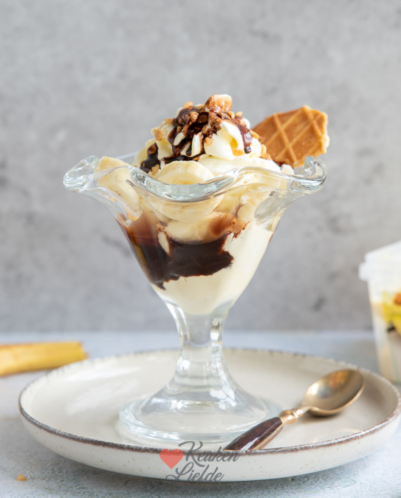 Een banana split met vanilleroomijs, banaan, slagroom en chocoladesaus. Een heerlijk ijsdessert dat nooit gaat vervelen. Ik serveer de bananensplit in een mooie coupe. Dat ziet er feestelijk uit en eet makkelijk. Je kunt de banana split ook op de klassieke manier serveren; op een plat bord waar twee halve bananen op liggen met daartussen bolletjes ijs. Eventueel kun je ook nog een kersje bovenop leggen.